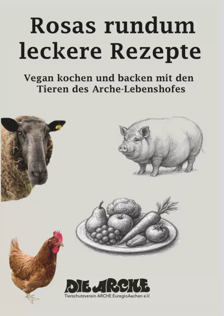… der Tierschutzverein (TSV) Arche Euregio Aachen hat ein Kochbuch aufgelegt: klein, fein, vegan. Ab sofort ist es unter dem Titel „Rosas rundum leckere Rezepte“ erhältlich. Ein besonderes Projekt, wie der Untertitel „Vegan kochen und backen mit den Tieren des Arche-Lebenshofes“ erahnen lässt.
